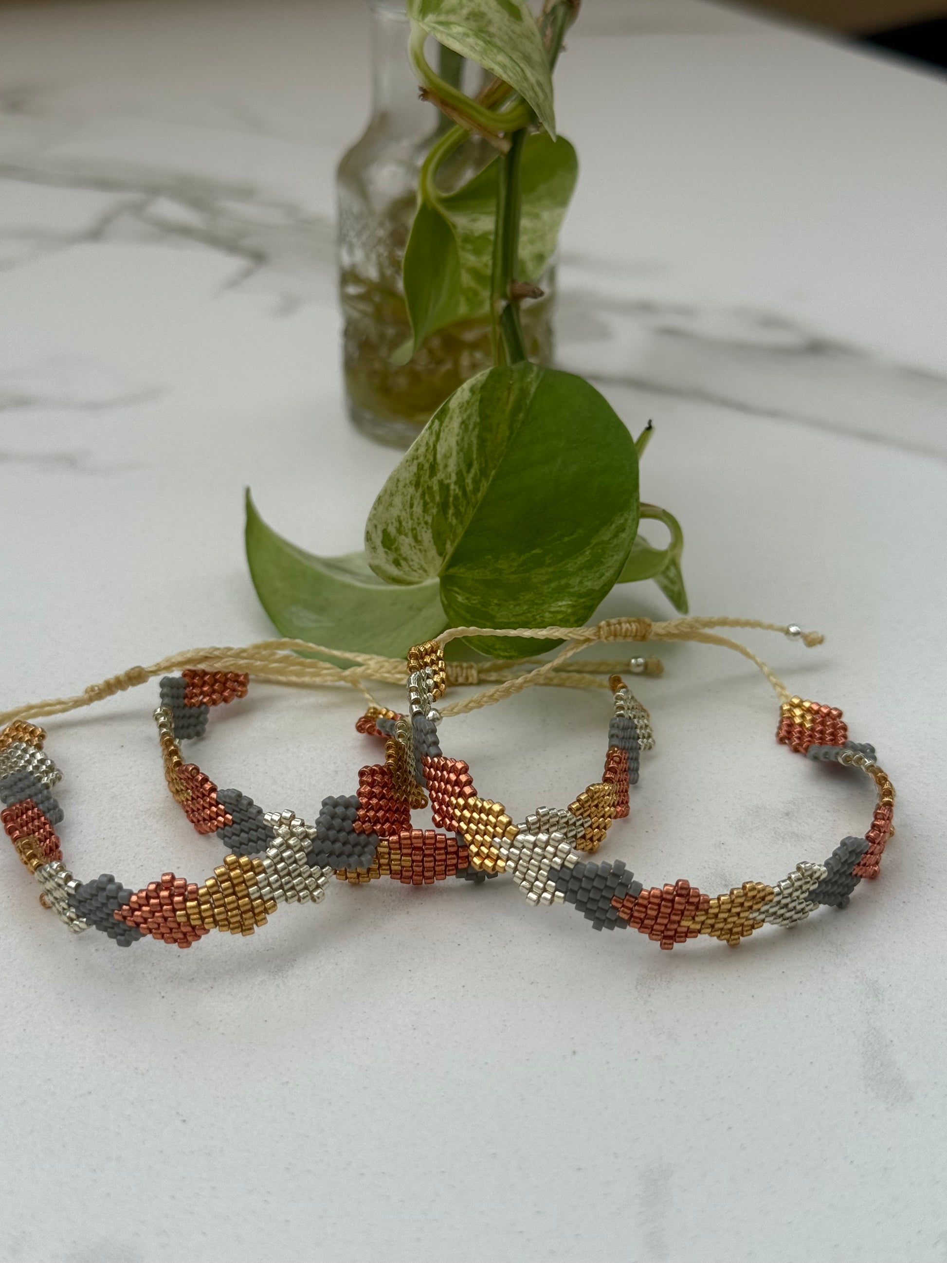 - Pulsera Tejida en Miyuki colores Dorado,gris, plata,cobrizo con acabados en hilo trenzado italiano con balines de plata.